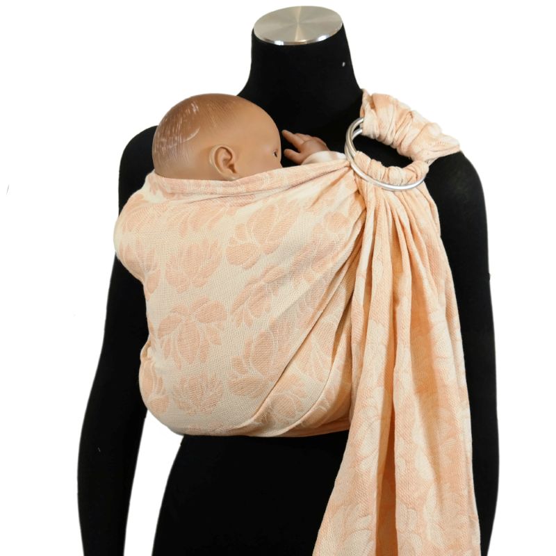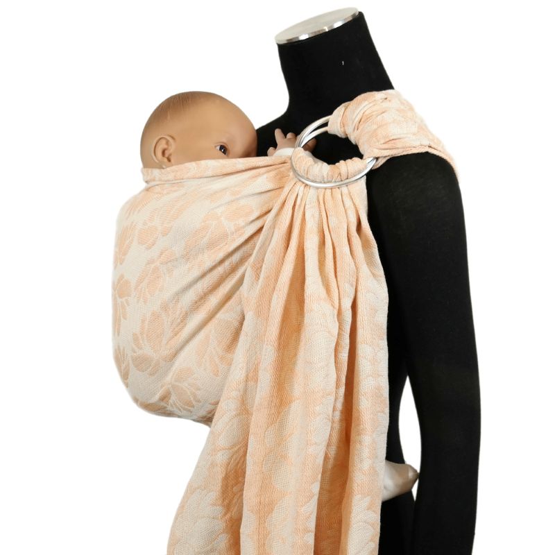 アプリコット色のスリングで赤ちゃん人形を抱っこするマネキン