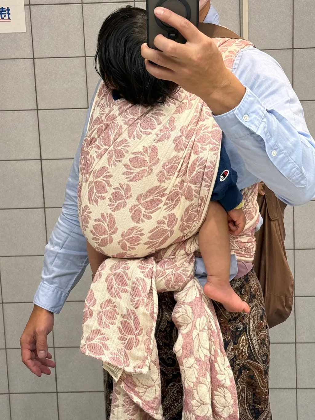 夏の抱っこに軽やかさと心地よさを届けてくれる特別なベビーラップ。やさしいクリームホワイトのオーガニックコットンに、長春色の野蚕(タッサーシルク)を織り込んだ蓮の花模様が広がります。希少な野生採取のタッサーシルクは、上品で自然な光沢をもち、生地にエレガントな風合いを添えています。咲き誇る蓮は、日本の寺院や池に静かに咲く夏の情景を想わせ、赤ちゃんとのつながりの象徴として寄り添います。